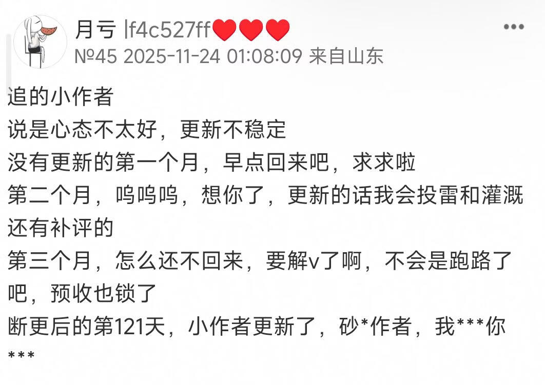 主题:作者无理由断更四个月,刚刚ta回我评论说会加快更新进度,我又原谅ta了…… [4]